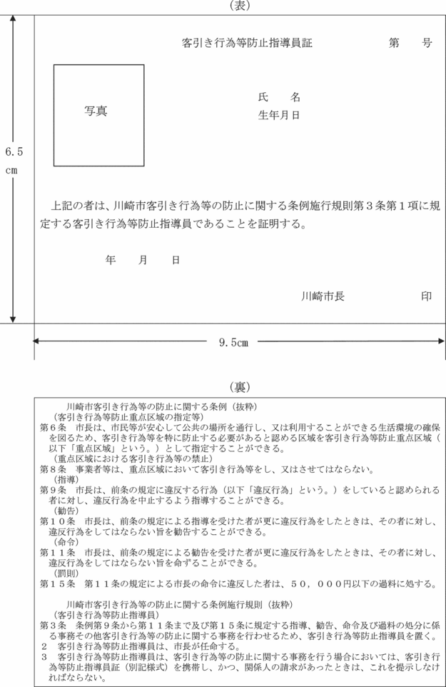3 客引き行為等防止指導員は、客引き行為等の防止に関する事務を行う場合においては、客引き行為等防止指導員証(別記様式)を携帯し、かつ、関係人の請求があったときは、これを提示しなければならない。