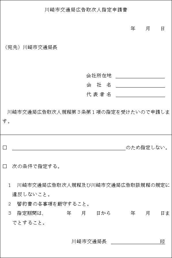 2 前項の指定(以下「指定」という。)を受けようとする者は、川崎市交通局広告取次人指定申請書(第1号様式)に次に掲げる書類を添付して局長に提出しなければならない。