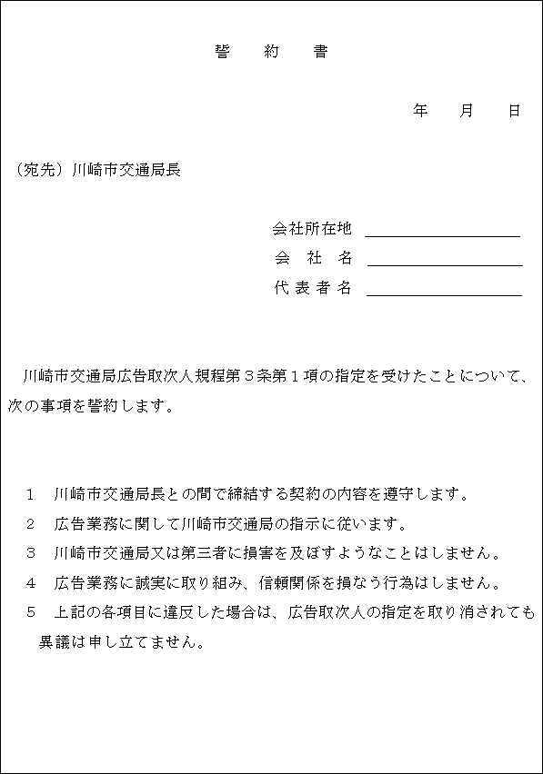 第4条 広告取次人は、指定の日の翌日から起算して5日以内に誓約書(第2号様式)を提出しなければならない。ただし、その期限が川崎市の休日を定める条例(平成元年川崎市条例第16号)第1条第1項に規定する市の休日に該当するときは、その日の翌日をもってその期限とみなす。
