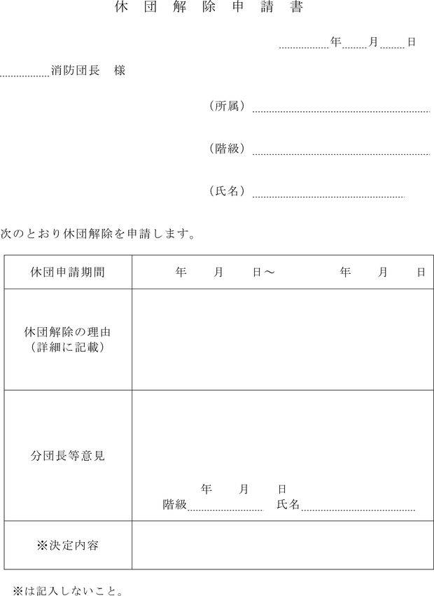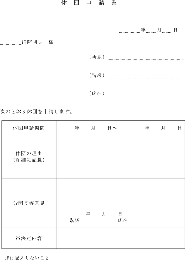 第4条 消防団員が休団又は休団の期間を延長するときは、あらかじめ、消防団長は市長に、消防団長以外の消防団員は消防団長に、休団申請書(第1号様式)により届け出て承認を受けなければならない。