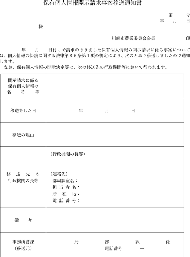 保有個人情報開示請求事案移送通知書