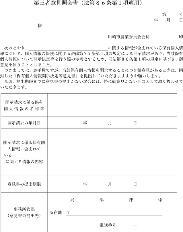 第9条 法第86条第1項の規定による通知は、第三者意見照会書(法第86条第1項適用)(第7号様式)により行うものとする。ただし、川崎市農業委員会が書面により行う必要がないと認めるときは、この限りでない。