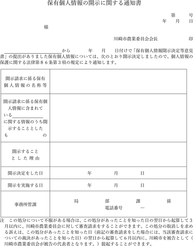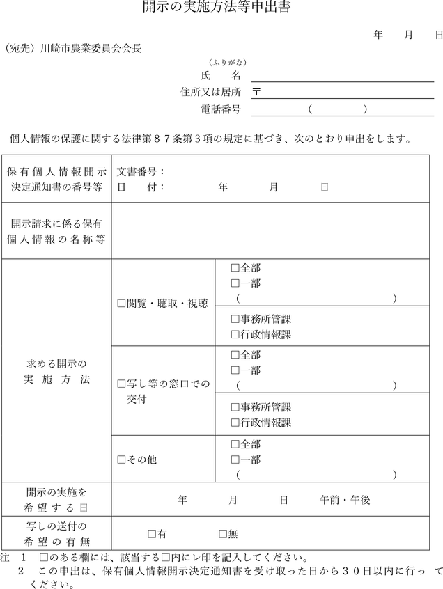 第4条 開示請求書は、保有個人情報開示請求書(第1号様式)又は法第77条第1項各号に掲げる事項を記載した書面によるものとし、次に掲げる方法により、川崎市農業委員会に提出するものとする。
