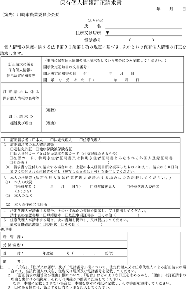 第14条 訂正請求書は、保有個人情報訂正請求書(第12号様式)又は法第91条第1項各号(条例第13条第1項各号に掲げる自己を本人とする保有個人情報に係る訂正請求の場合にあっては、第2号を除く。)に掲げる事項を記載した書面によるものとし、次に掲げる方法により、川崎市農業委員会に提出するものとする。