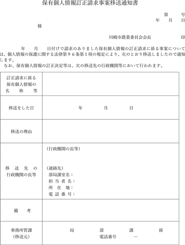 保有個人情報訂正請求事案移送通知書