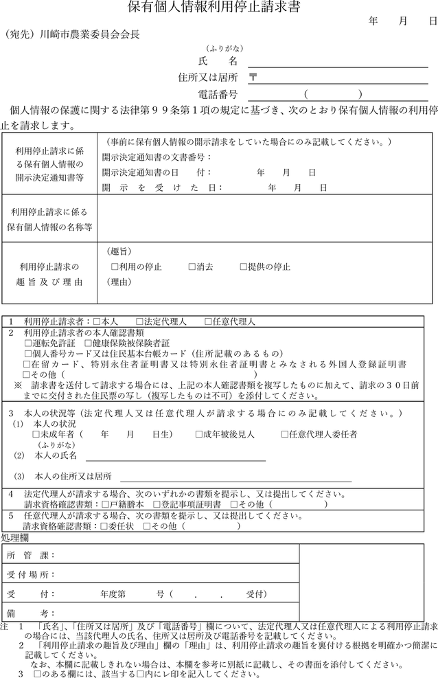 保有個人情報利用停止請求書