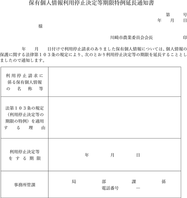 保有個人情報利用停止決定等期限特例延長通知書