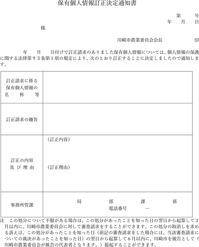 保有個人情報訂正決定通知書