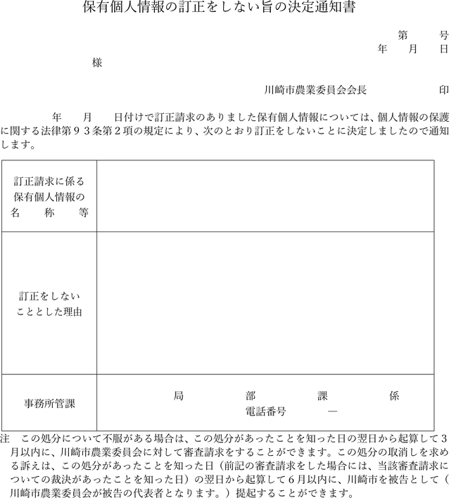保有個人情報の訂正をしない旨の決定通知書
