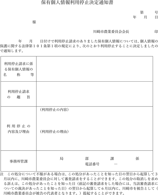 保有個人情報利用停止決定通知書